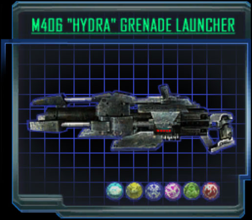 Unreal 2's Grenade Launcher, the M406 Hydra, is named after the many-headed Lernaean Hydra due to its ability to use multiple 40mm grenade types. At the beginning of the game Dalton only has access to explosive fragmentation grenades, but he will collect the other types along the way. Regular fire launches the currently loaded grenade, whose explosion can be delayed by holding the trigger for a short while. Alternate fire cycles through grenade types.