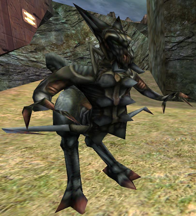 These slightly larger Skaarj wear a fair amount of armor, including boots, thigh pads, a full chest plate, and shoulder pads. Spikes adorn the top of the boots and chest plate, and curved blades follow the countours of the thigh and shoulder pads. The armor appears a little more clumsy and impractical than that of the classic Skaarj, which would seem to suggest a difference in combat style and priorities among Skaarj clans. Beyond appearances, Medium Skaarj behave like Light Skaarj, but are able to withstand and deal out more damage. When killed, their armor gives off a latent energy charge that the player can absorb to add to his own energy shielding level.