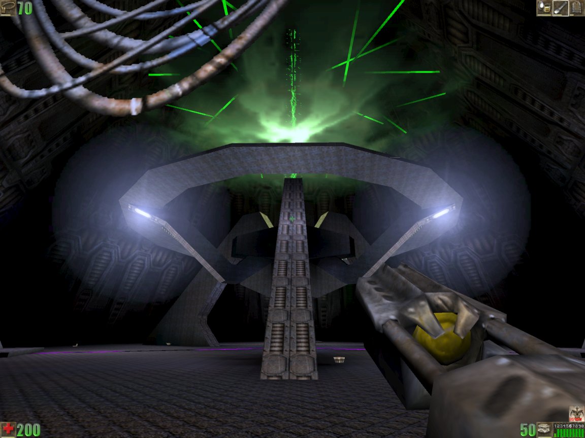 You start between the doors by which you escaped from the previous map and another set of doors ahead. Go through these doors and be sure to collect the Flak Cannon and Searchlight beyond. You will be in a huge room with the equally huge generator in the centre. Don't go any further in yet though - read on first.